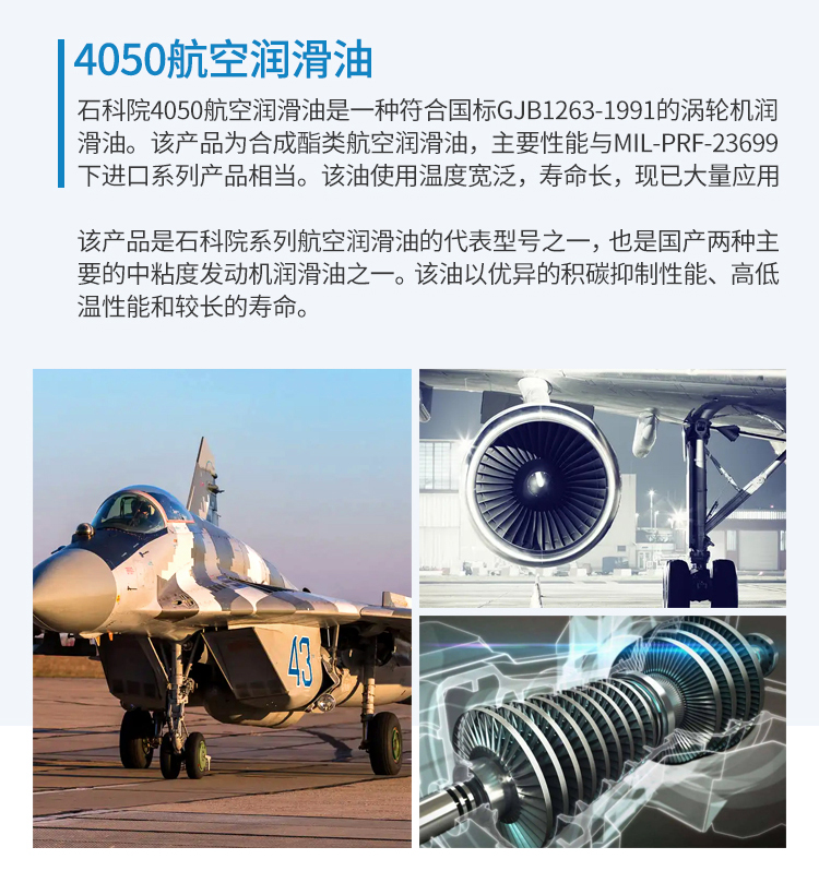 是石科院生產的、滿足國軍標GJB 1263-1991的國產高溫合成航空潤滑油。4050油的的組成是新戊基多元醇酯外加抗氧劑、抗腐蝕劑和抗泡劑等添加劑。其主要是針對渦輪風扇發動機和渦輪噴氣發動機研制,目前主要應用于各型裝備了渦扇、渦噴和渦軸發動機的軍用飛機和民用燃氣輪機組。