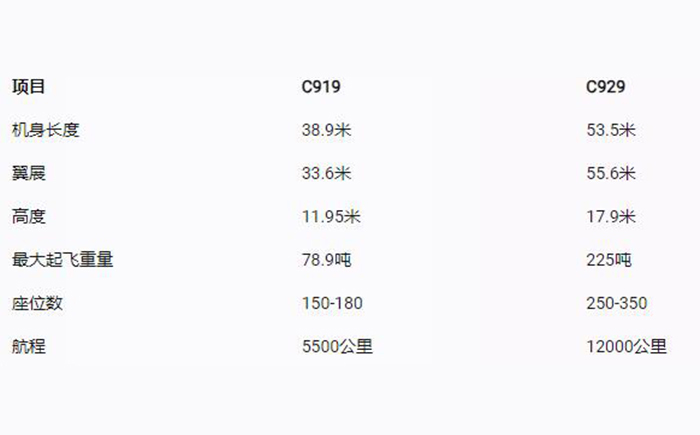 C919是一款中短程窄體客機,而C929是一款遠程寬體客機,因此C929的機身長度、翼展、高度、最大起飛重量、座位數和航程都比C919大很多。具體數據如下圖所示: